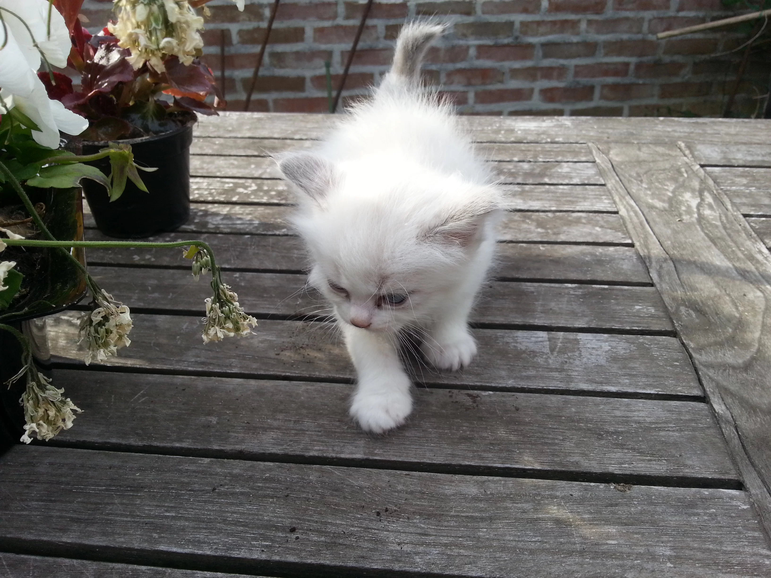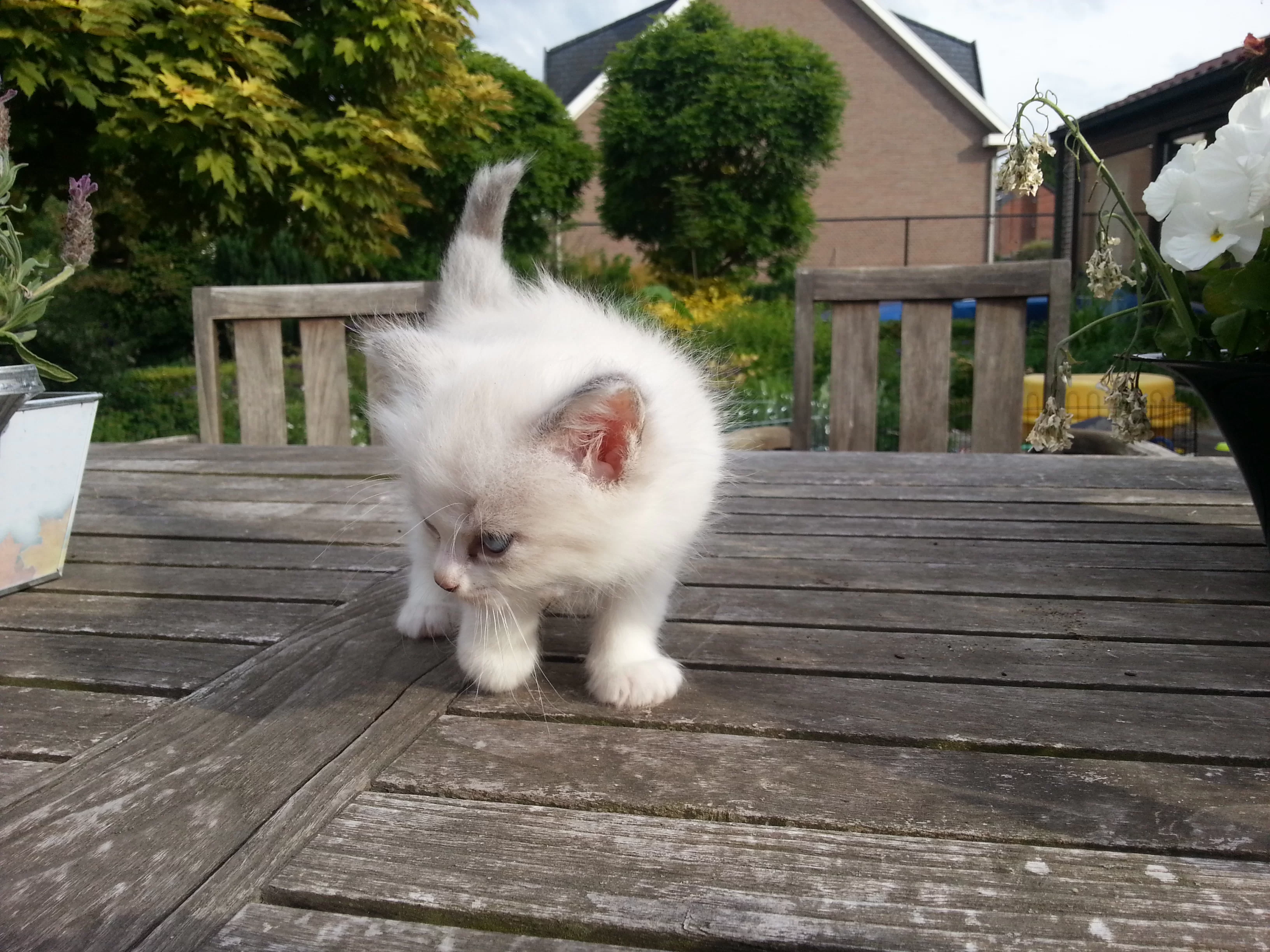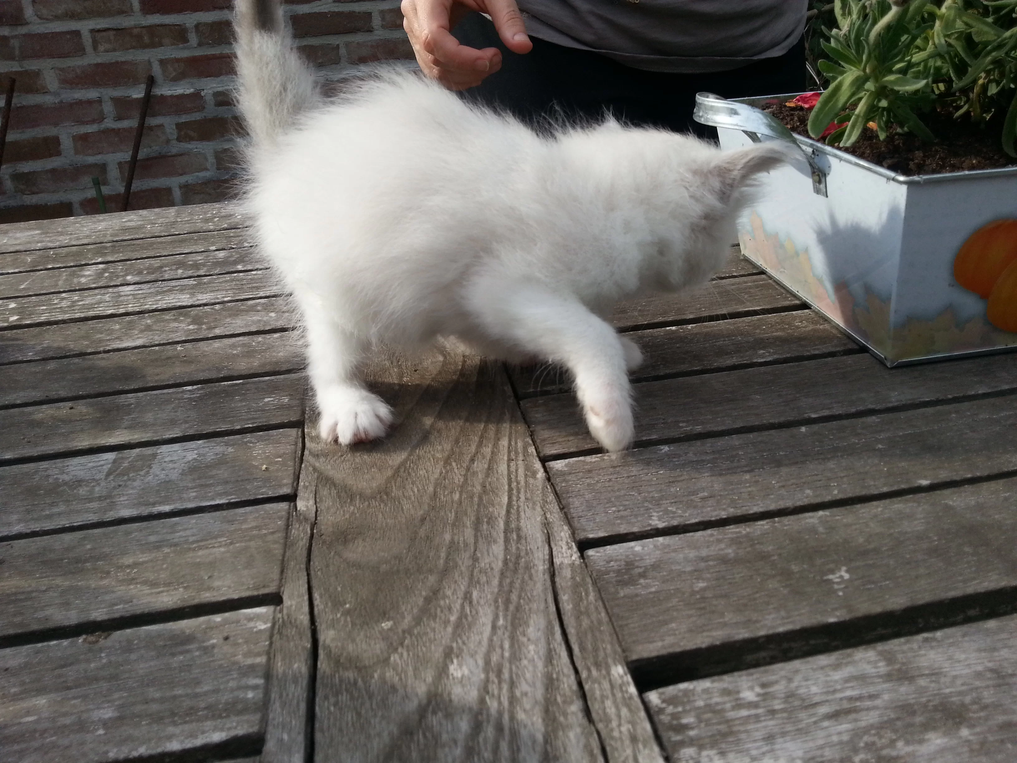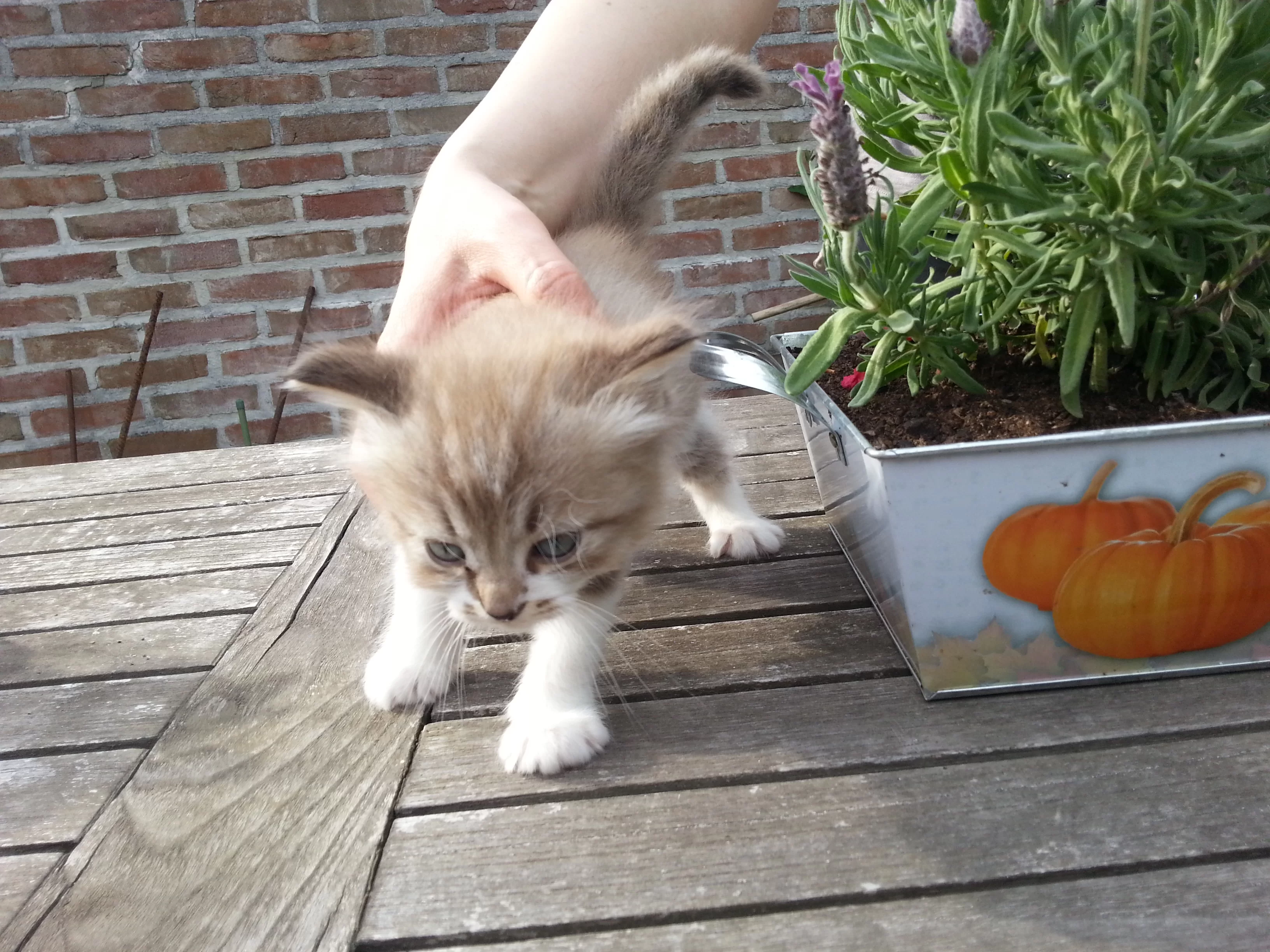 Ze zaten voor te slapen nog in een doos tot 4 dagen geleden. Snoesje was daar niet mee tevreden en ging ze 2 dagen na elkaar uit de doos halen om ze vervolgens op de grond te zetten. We hebben de doos maar weggehaald nu. Het had toch geen zin meer. :)